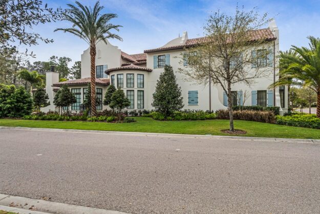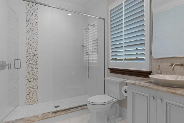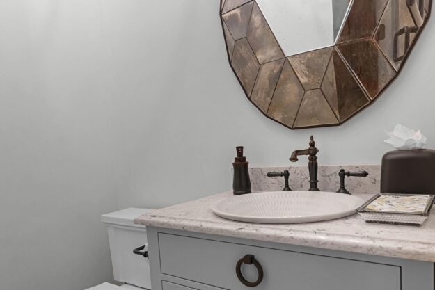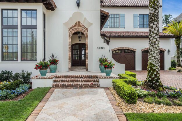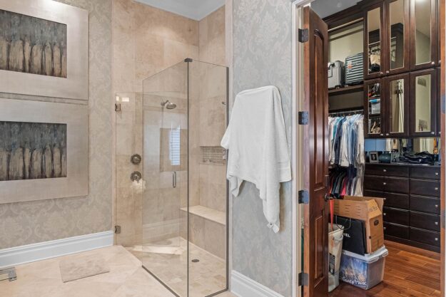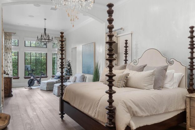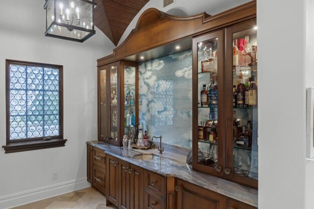 Other details involved with the renovation included a stunning wagon-wheel ceiling coffer over new dining room with hand-painted details, a whole-house audio system, a new bar & temperature controlled wine-room with custom cabinets and englameze detail on backsplash of bar and corking counter in wine room. The corking room features a custom antique window and a lounge-groove groin ceiling with a 4-way gothic arch. The staircase was fitted with a custom baluster and a curved glass window underneath that looks into a new library featuring custom built-ins.
