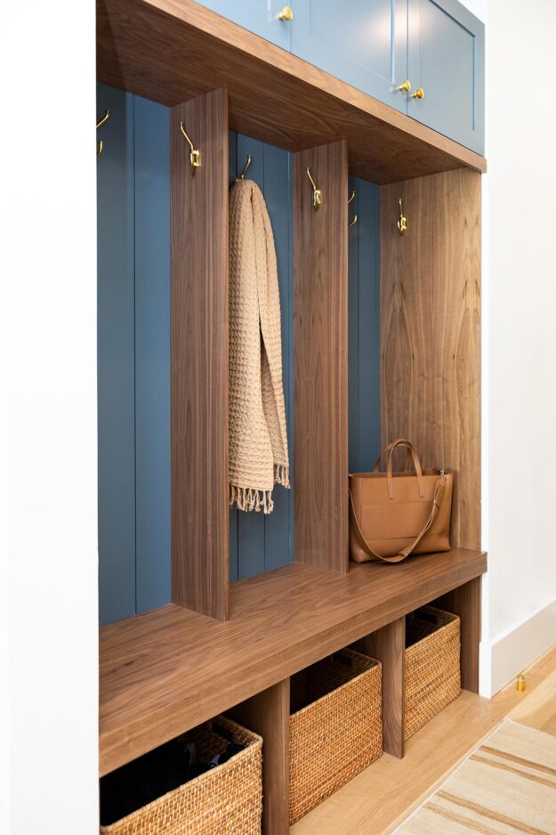 The mud room includes a new bench & locker built-in where another design theme is repeated in beautiful combination of natural wood tones and painted cabinetry.