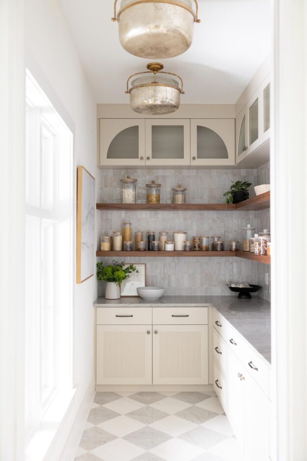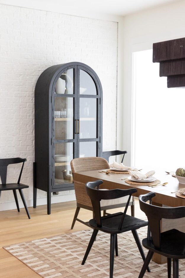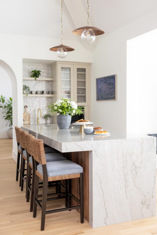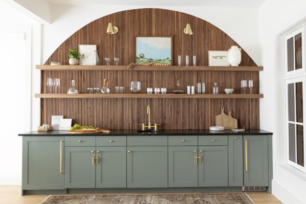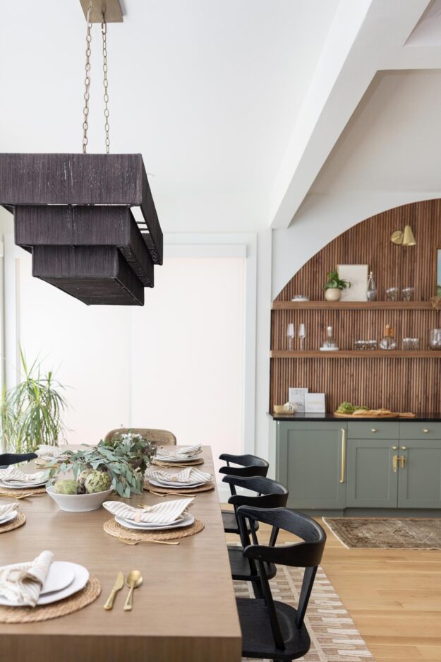 The arched design element is also reflected in a statement wall and built-in connecting the dining room with the open kitchen. The built-in incorporates custom cabinets and a wet bar with a large, arched wall clad with reeded wood and floating shelves.