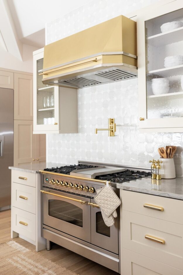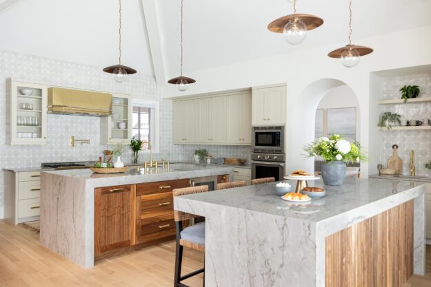 The kitchen itself was gutted and remodeled with dual quartzite waterfall islands, built-in appliances including a Miele espresso machine, and brass plumbing fixtures and matching range hood.