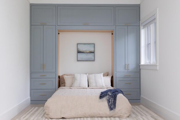 A spare room features a wall-wide built-in that includes a hidden Murphy bed for guests.